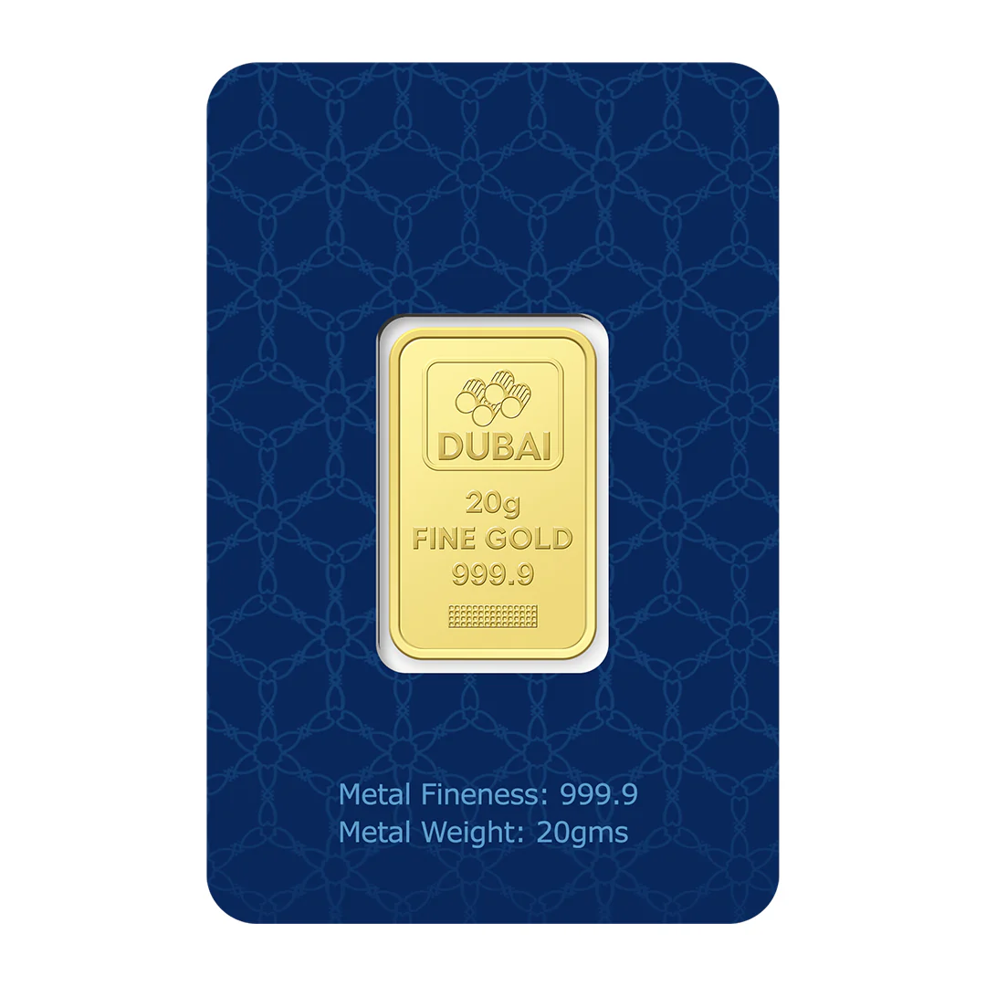 A 20 gram 24K fine gold bar crafted with 999.9 purity, ideal for secure investment and long-term value preservation.